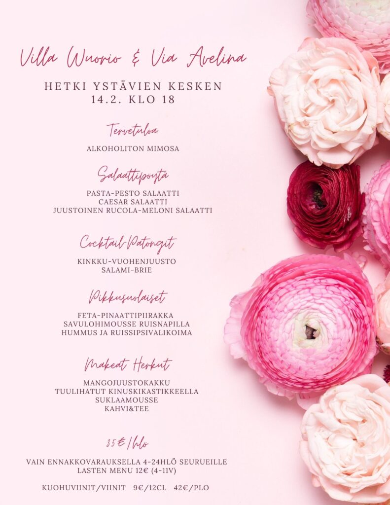 Tule viettämään hetki ystävien kesken ma 14.2. klo 18 tunnelmalliseen Villa Wuorioon, joka on puettu hempeään ystävänpäivätunnelmaan yhteistyössä Via Avelina kanssa.